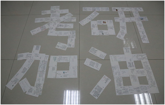 这是学生们为即将考研的学长学姐精心准备的祝福礼物。早在半个月前,学院学生党支部党员就开始策划本次行动,提前将明信片分发给老师和学生,由他们写上对考研学子的寄语,有的学生还加上自己的创意涂鸦。最后,大家将这些明信片摆成“考研加油”的字样,给考研学子加油打气。