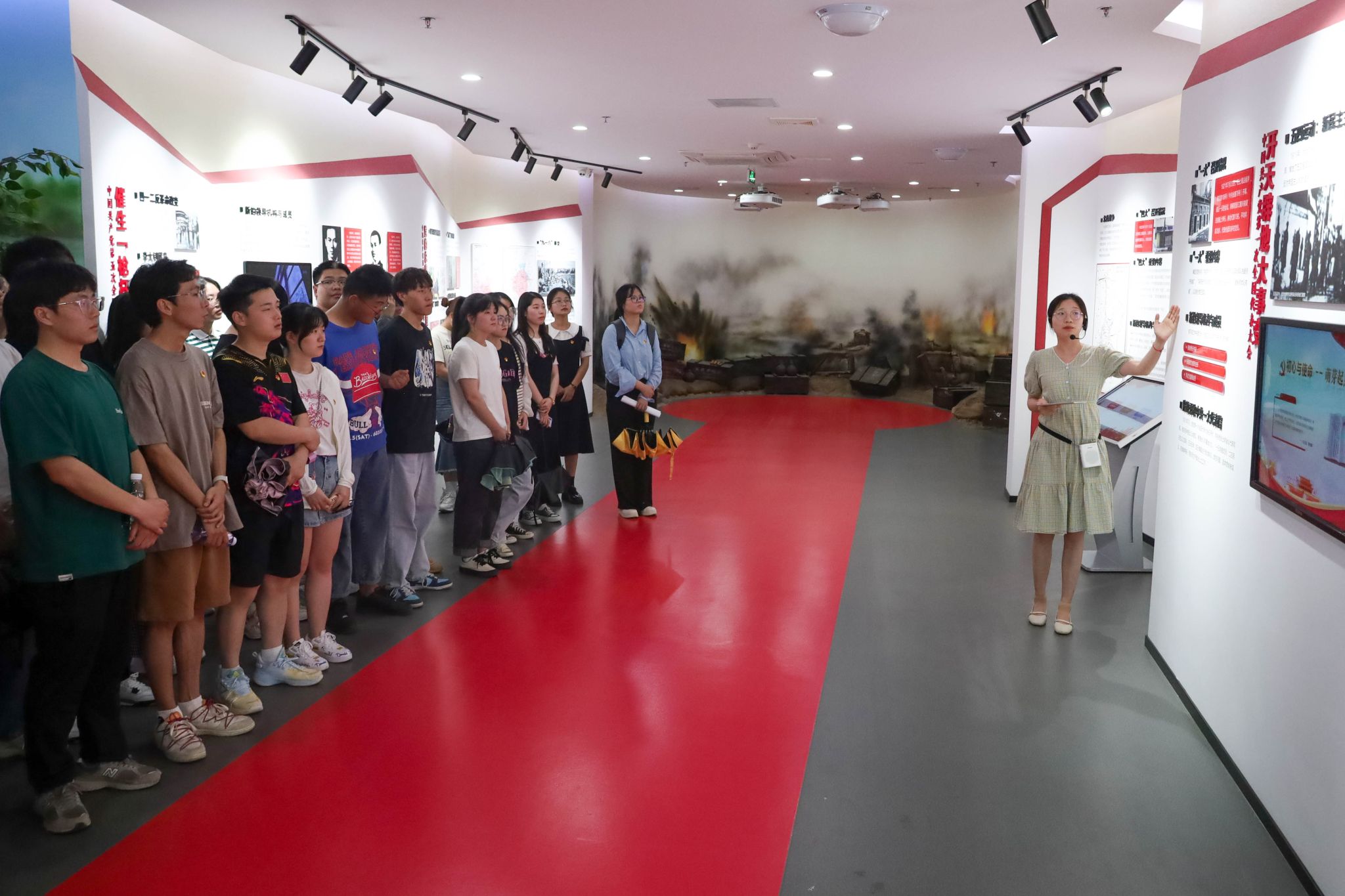 党建馆共有中共党史、学“习”区、锋领宜秀三个功能展区。步入党史展示区,学生党员们看到一艘缩小的红船模型,红船背后,投影仪投射的视频生动地再现了中国共产党诞生的场景。结合馆内的音频、影像等数字媒体技术,讲解员详细讲述党史、新中国史、改革开放史、社会主义发展史、中华民族发展史等五史知识,学生党员们深切感受中国共产党从诞生到发展壮大的百年历程。