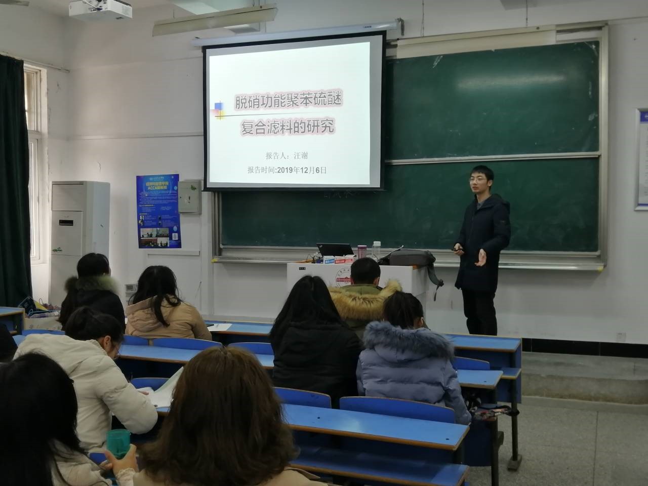 青年教师汪谢博士在龙山校区教学楼C105教室作了一场题为“脱硝功能聚苯硫醚复合滤料的研究”的学术报告,学院材料化学专业部分教师及16、17级部分本科生参与了这次学术交流活动。