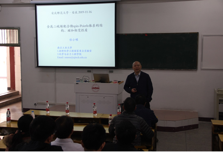 任小明教授作了以“金属二硫烯配合物spin—Peierls体系的结构,磁和相变性质” 为主题的报告。报告中任教授首先介绍了光电磁功能配合物和d8电子组态过渡金属配合物spin-Peierls体系,然后主要围绕开骨架金属二硫烯配合物spin-Peierls体系的结构性质进行了系统的报告。任教授报告内容丰富,既有生动有趣、内容新颖的前沿问题阐述,又有参考价值高的经验分享,拓宽了师生的科研思路和激发了学生的学习兴趣。