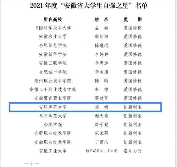 2019级材料化学(3)班梁婧同学荣获安徽省自强之星(创新创业)荣誉称号。