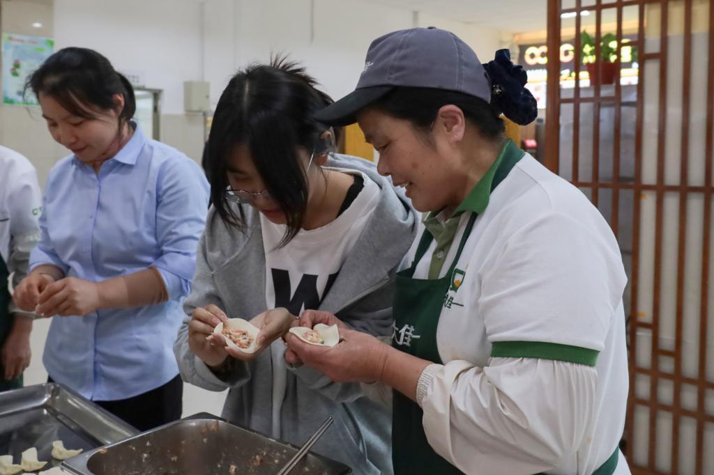 徐梦婷也是食堂包饺子“大军”中的一员。少放一点馅料,左手握拳伸出拇指与食指,右手将饺子内外侧的皮捏出褶皱,跟着食堂阿姨的教学,徐梦婷从手法生疏到能独立包出一只好看“月亮饺”,得到食堂阿姨的“真传”。