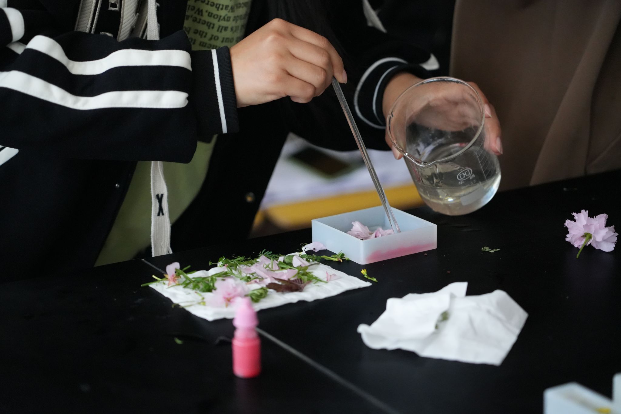 科学美俱乐部开展自制滴胶杯垫活动,将校园中的植物在滴胶中封存,制成滴胶杯垫,留住校园的春日美景。