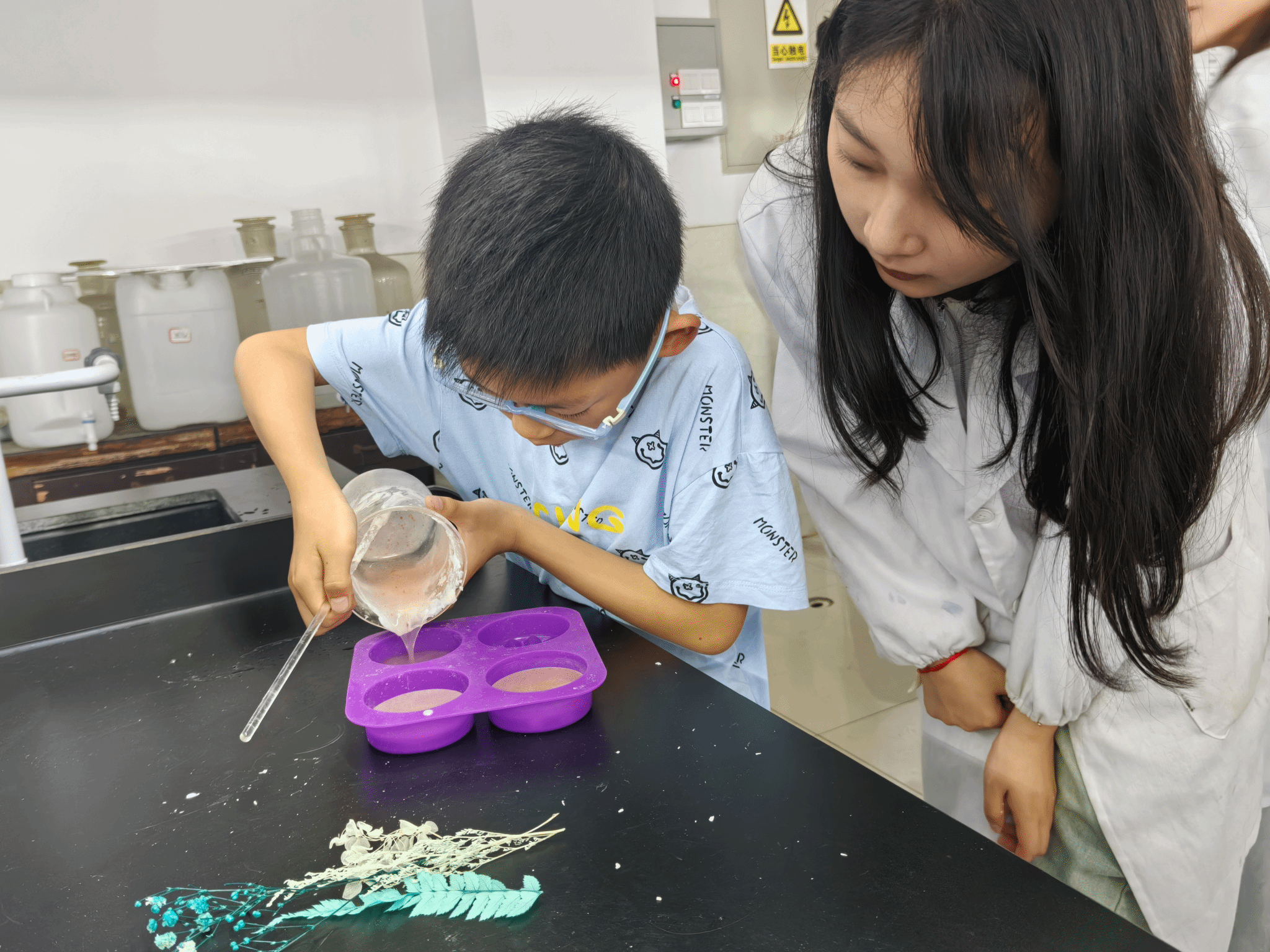 实验室里热闹非凡,40余名不同年龄段的小朋友和家长们齐聚一堂,共同制作香薰蜡片,解锁儿童节新体验。