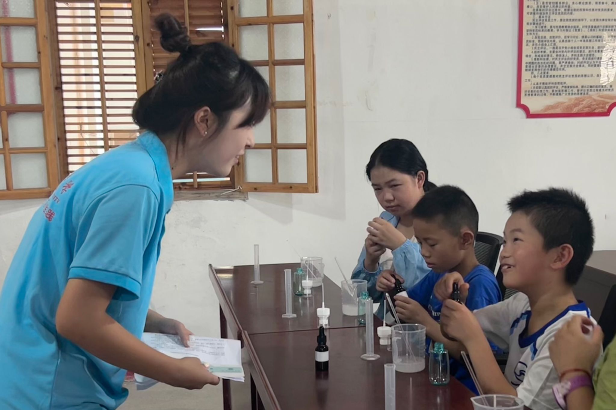 “学以致用——H₂O传习工艺坊”化学工艺品制作体验暑期社会实践团联合安庆市宜秀区大龙山镇团委,为百华社区的孩子们开展了一场奇妙的“化学工艺品制作之旅”。