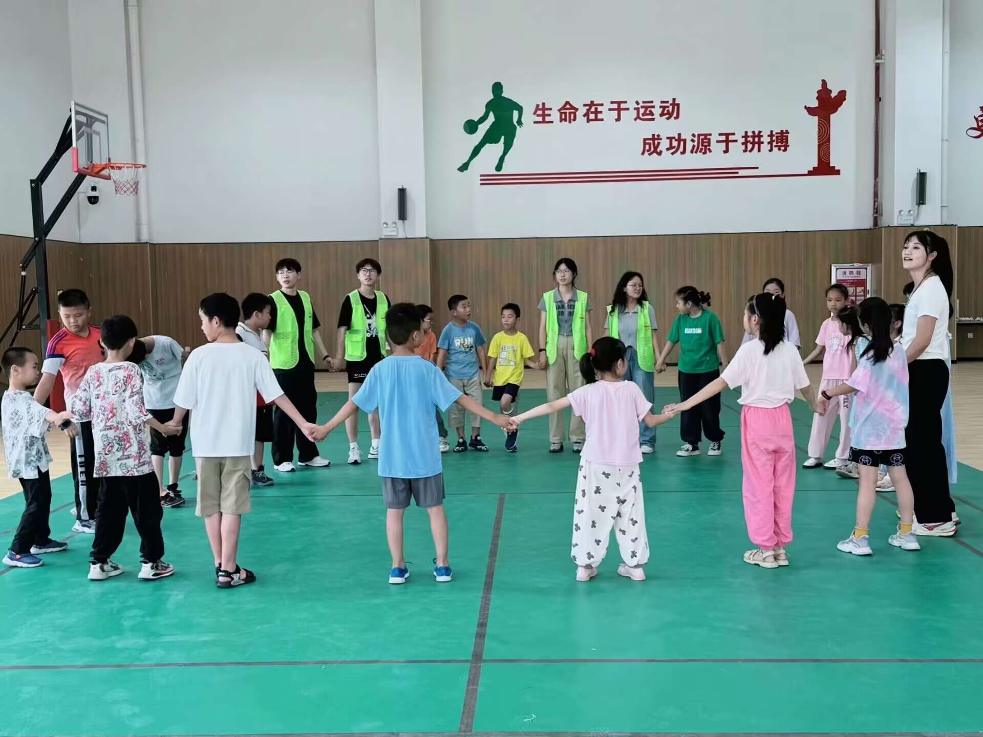 此外,实践团还协助安庆市华中路第三小学的老师们举行了一场趣味运动会。赛前,队员们带领孩子们进行拉伸,为比赛做好准备。在“击鼓传花”环节,成员与孩子们一同跟着音乐节奏传递手中的篮球,音乐停止,若球仍在手中的孩子“中奖”,需现场表演一篇诗歌朗诵,若是志愿者,则需演唱歌曲。孩子们在多个游戏环节不同搭档的过程中与同伴、老师有了更加亲密的接触、更深入的交流,彼此间的“冰块”慢慢消融。