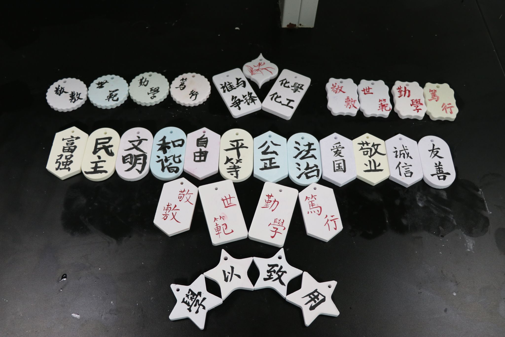 富强、民主、文明……社会主义核心价值观的内容竟然出现在小朋友们的香薰石膏上。将书法课与化学工艺品制作结合的想法来自于团队队长、化学工程与工艺专业2022(2)班的陈蕊。在她看来,“书法作为中华优秀传统文化,在石膏“上”书法课既可以推动文化的传承与创新,又可以激发小朋友们探索化学的兴趣。” 在燎原社区进行返家乡实践的潮人论坛