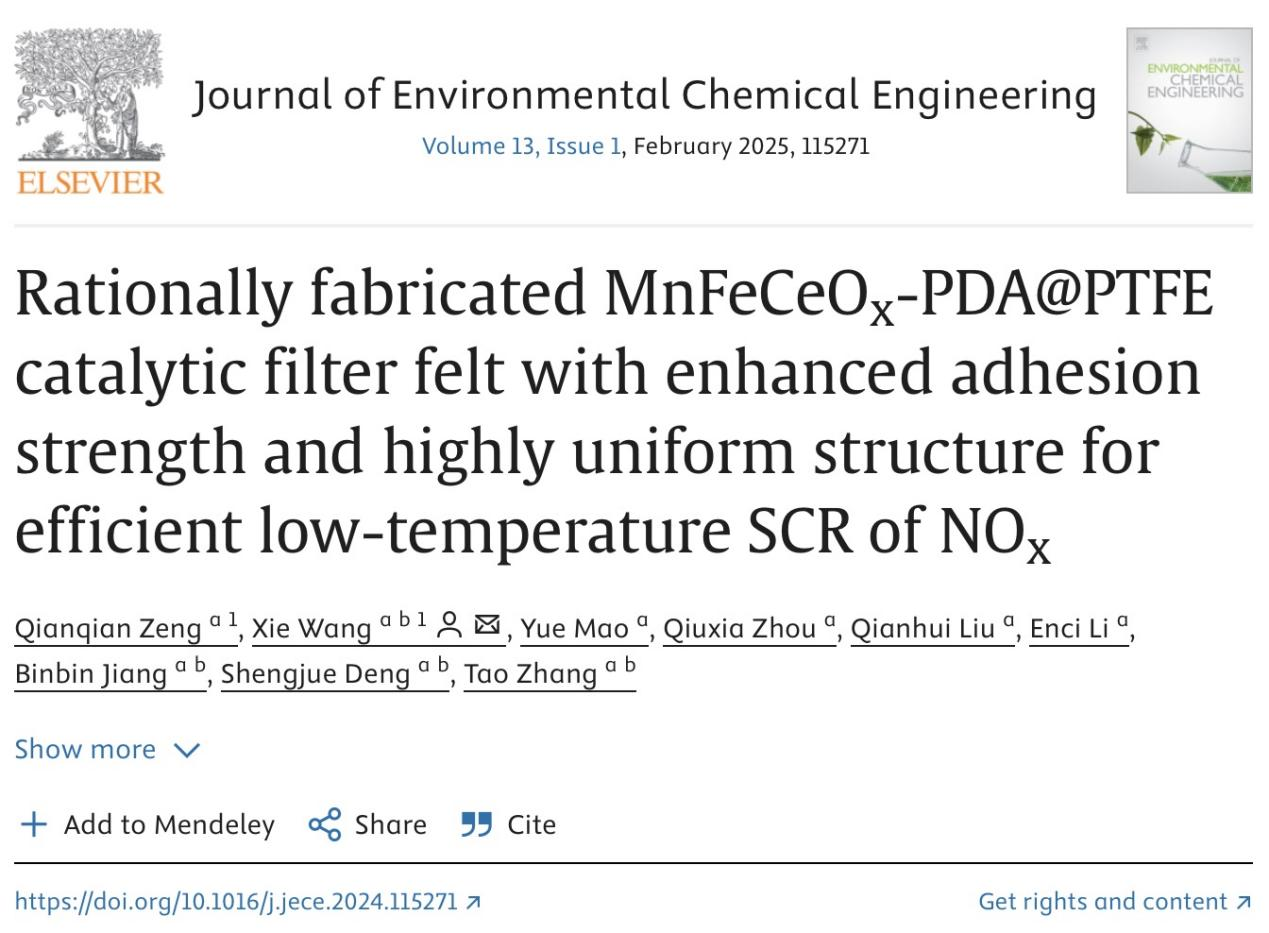 化学2022级本科生曾倩倩以第一作者身份在国际知名杂志《Journal of Environmental Chemical Engineering》(中科院TOP期刊,影响因子为7.4),发表题为“Rationally fabricated MnFeCeOx-PDA@PTFE catalytic filter felt with enhanced adhesion strength and highly uniform structure for efficient low-temperature SCR of NOx”的研究性学术论文。该论文以潮人论坛