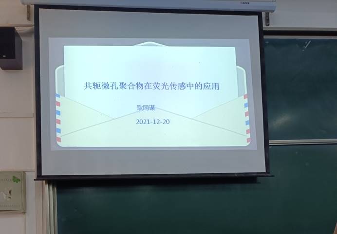 会上,耿同谋教授从环境污染物的危害介绍了硝基芳族化合物、单质碘、重金属离子和生命物质检测的意义,接着对共轭微孔聚合物在荧光传感中的应用进行了系统介绍。随后,详细介绍了其课题组近年来在共轭微孔聚合物的合成、表征、形貌分析及在荧光传感方向的研究成果,并对环境污染物及生命物质荧光检测的发展方向进行了展望。会后,对部分学生的疑问进行了详细地解答。