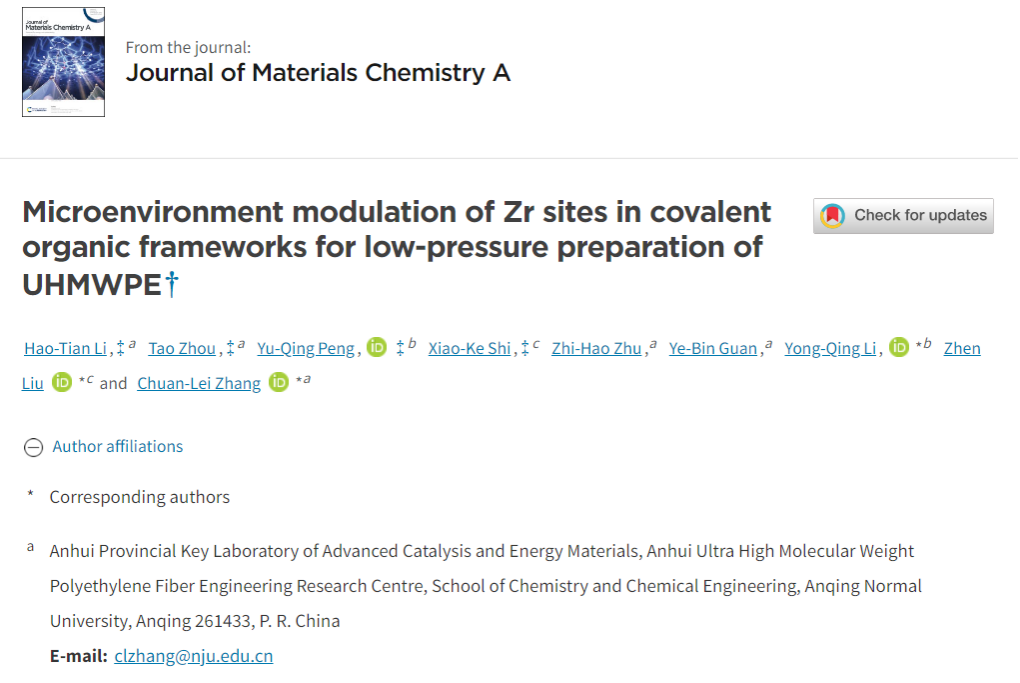 在国际权威期刊《Journal of Materials Chemistry A》(影响因子10.7)发表题为“Microenvironment modulation of Zr sites in covalent organic frameworks for low-pressure preparation of UHMWPE”的论文 ,并入选该期刊热点文章。该论文第一作者为我校化学专业2022级硕士生李浩天,第一通讯作者为我校潮人论坛