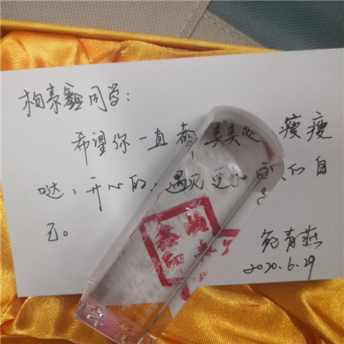 专门为351名本硕毕业生准备了定制印章礼盒,得到学生好评。印章上有学校校名及校徽,正面左侧印有“潮人论坛