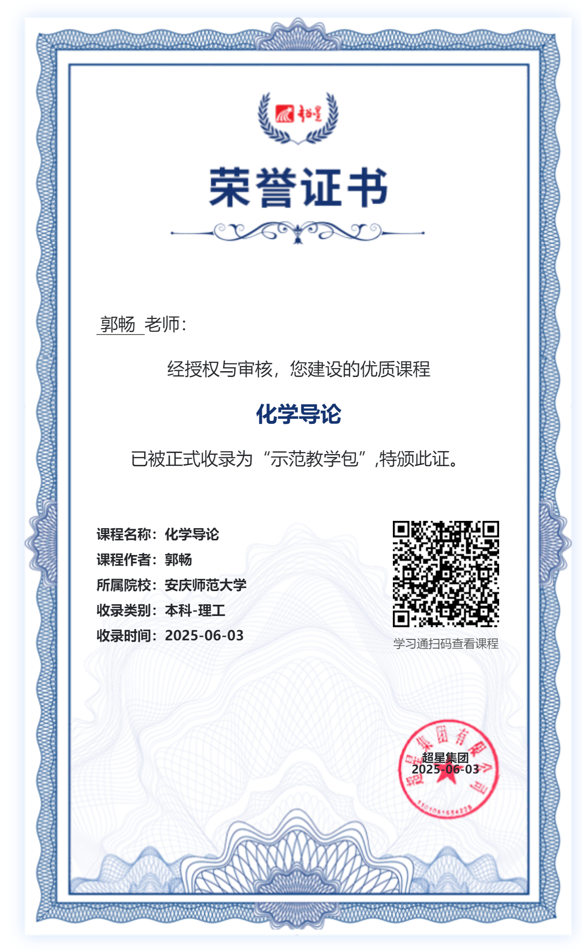 郭畅教授主持建设的共享课程资源《化学导论》,经超星集团有限公司严格审核与授权,正式收录为本科理工类“示范教学包”。该课程资源是2023年获评的安徽省省级课程思政示范课,是郭畅职工创新工作室的重要建设成果,也是我校基础课程持续改革创新的重要成果,亦是郭畅教授继《物理化学(1)(2)》在线课程后,第二门获评超星“示范教学包”的课程,标志着我校在推动优质课程资源共享与教学模式创新方面取得的又一标志性进展。