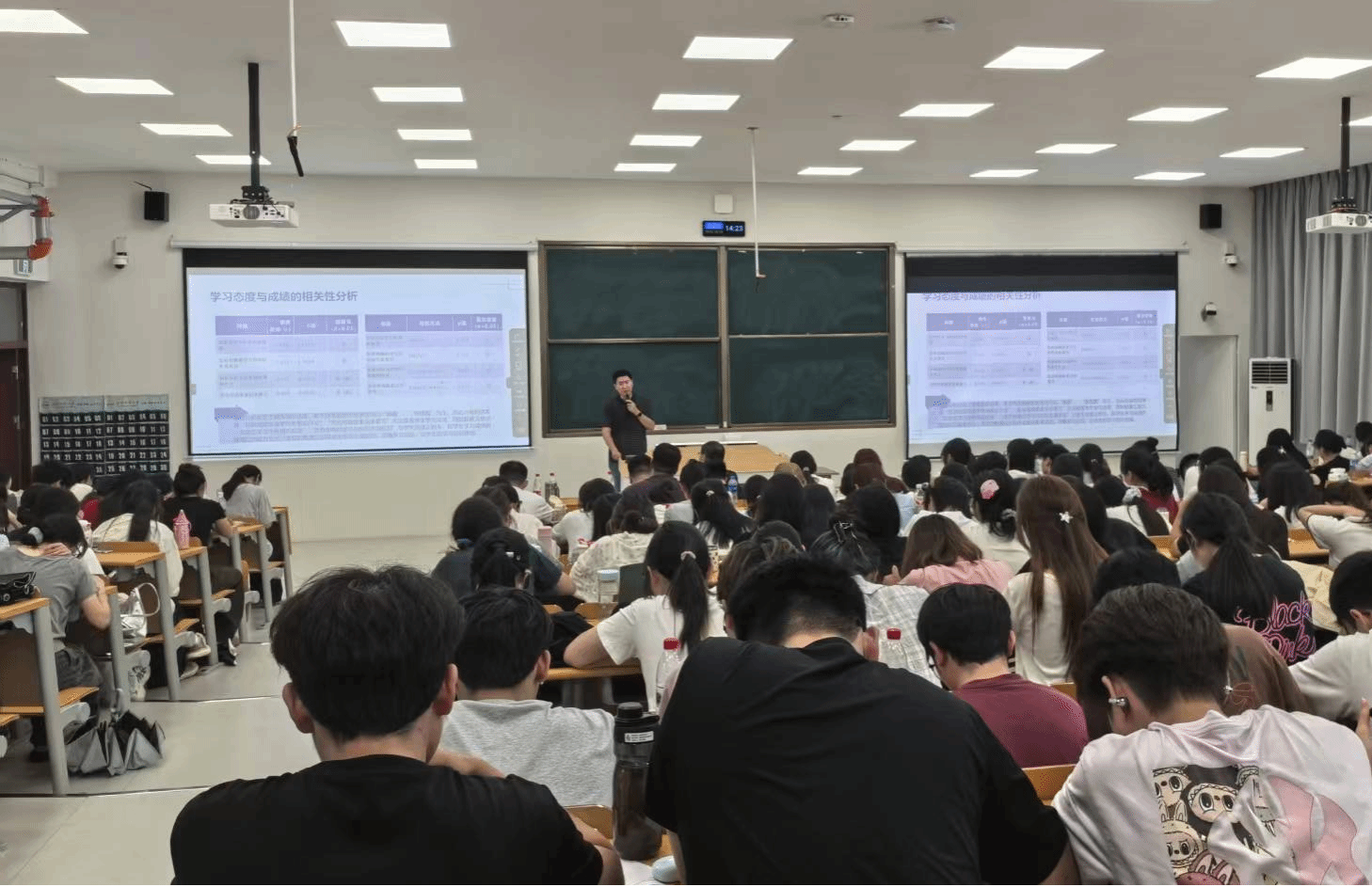 院长王钧伟教授主持报告,学科教学(化学)硕士点的导师与研究生、23级化学专业本科生300余人参加报告会。