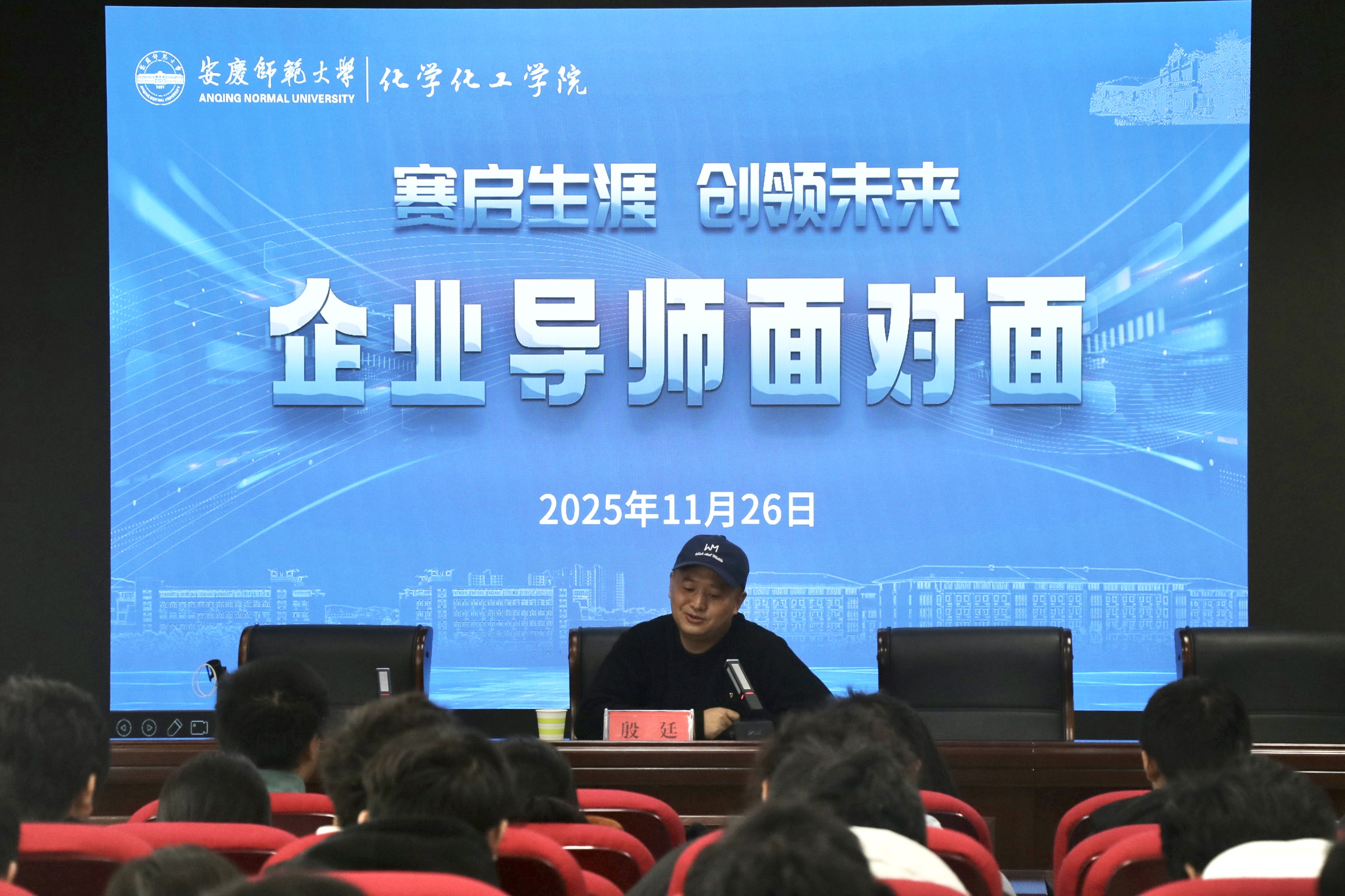 在H401会议室举办“赛启生涯,创领未来”企业导师面对面活动。锦美星灿新材料(安徽)有限公司董事长殷廷先生担任主讲,为百余名同学带来一场锚定市场刚需、契合时代脉搏的职业生涯报告。