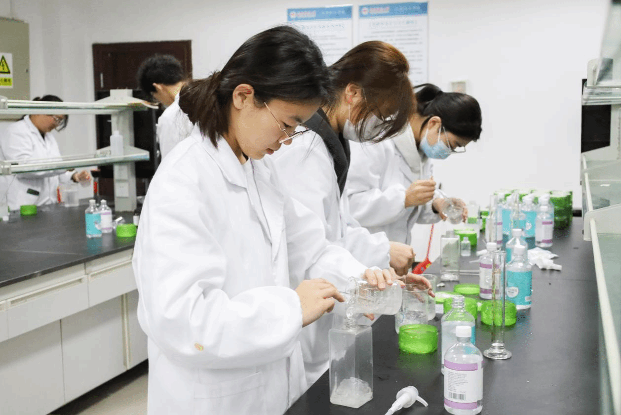 加入蒸馏水稀释酒精、用玻璃棒搅拌芦荟胶、滴入适量香精……学院一楼实验室内,学生们分成三组,分别研制茉莉花、玫瑰花、桂花三种不同香味的洗手液。“赠人鲜花,手留余香。”化学工程与工艺专业2021(1)班的陶萧宇表示,“免洗洗手液的使用十分便利,花卉的香味也有助于帮助同学、老师们舒缓心情、缓解疲劳。”